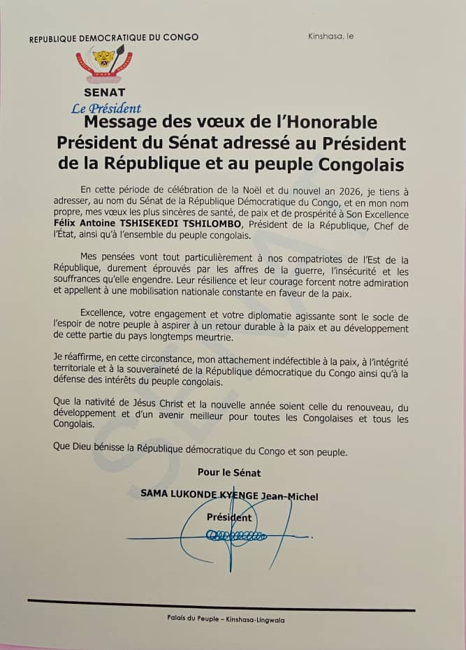 À l’occasion des festivités de Noël et du Nouvel An 2026, le président du Sénat, Jean-Michel Sama Lukonde, a adressé un message de solidarité et d’espoir au chef de l’État et à l’ensemble de la population congolaise, particulièrement à celle des zones sous occupation de l’armée rwandaise et de ses supplétifs de l’AFC-M23.