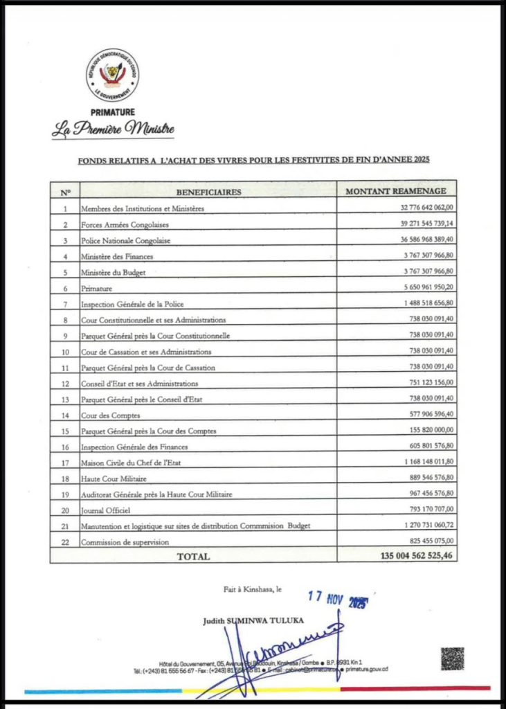 La Première ministre Judith Suminwa a donné son quitus pour un décaissement de plus de 135 milliards de Francs congolais pour l’achat de vivres destinés aux festivités de fin d’année en faveur des ministères, institutions et services publics.