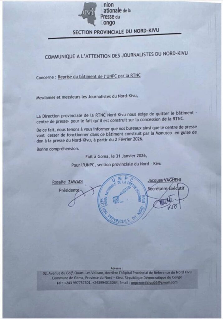 L’annonce est tombée ce samedi 31 janvier 2026. Par le biais d’un communiqué officiel, la section provinciale de l’Union Nationale de la Presse du Congo (UNPC) a confirmé la fin de ses activités dans ses locaux actuels. Signé par Rosalie Zawadi (Présidente) et Jacques Vagheni (Secrétaire Exécutif), le document précise que la RTNC exige la restitution immédiate du bâtiment.