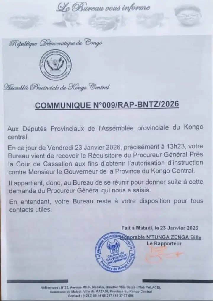 Le Bureau de l’Assemblée provinciale du Kongo-Central a dans un communiqué de presse de ce vendredi 23 Janvier 2026, annoncé l’accusé réception, ce vendredi à 13h23, du réquisitoire du Procureur général près la Cour de cassation sollicitant l’autorisation d’ouvrir une instruction judiciaire à l’encontre de Grâce Masuangi Nkuanga Bilolo, Gouverneur de la province du Kongo-Central.