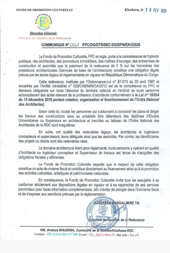 « Le FPC rappelle que le respect de cette obligation constitue un acte de civisme fiscal et contribue directement au financement ainsi qu’à la promotion des activités culturelles, artistiques et patrimoniales nationales Conformément à l’Ordonnance-Loi n° 87-013 du 03 avril 1987 et encadrée par l’Arrêté ministériel n° 029/CAB/MIN/CA/2012, cette redevance est de la compétence du FPC et demeure obligatoire sur toute l’étendue du territoire national en l’endroit de toute personne accomplissant des actes relevant de la profession d’architecte », a ajouté le document de cet établissement public » a-t-on lu